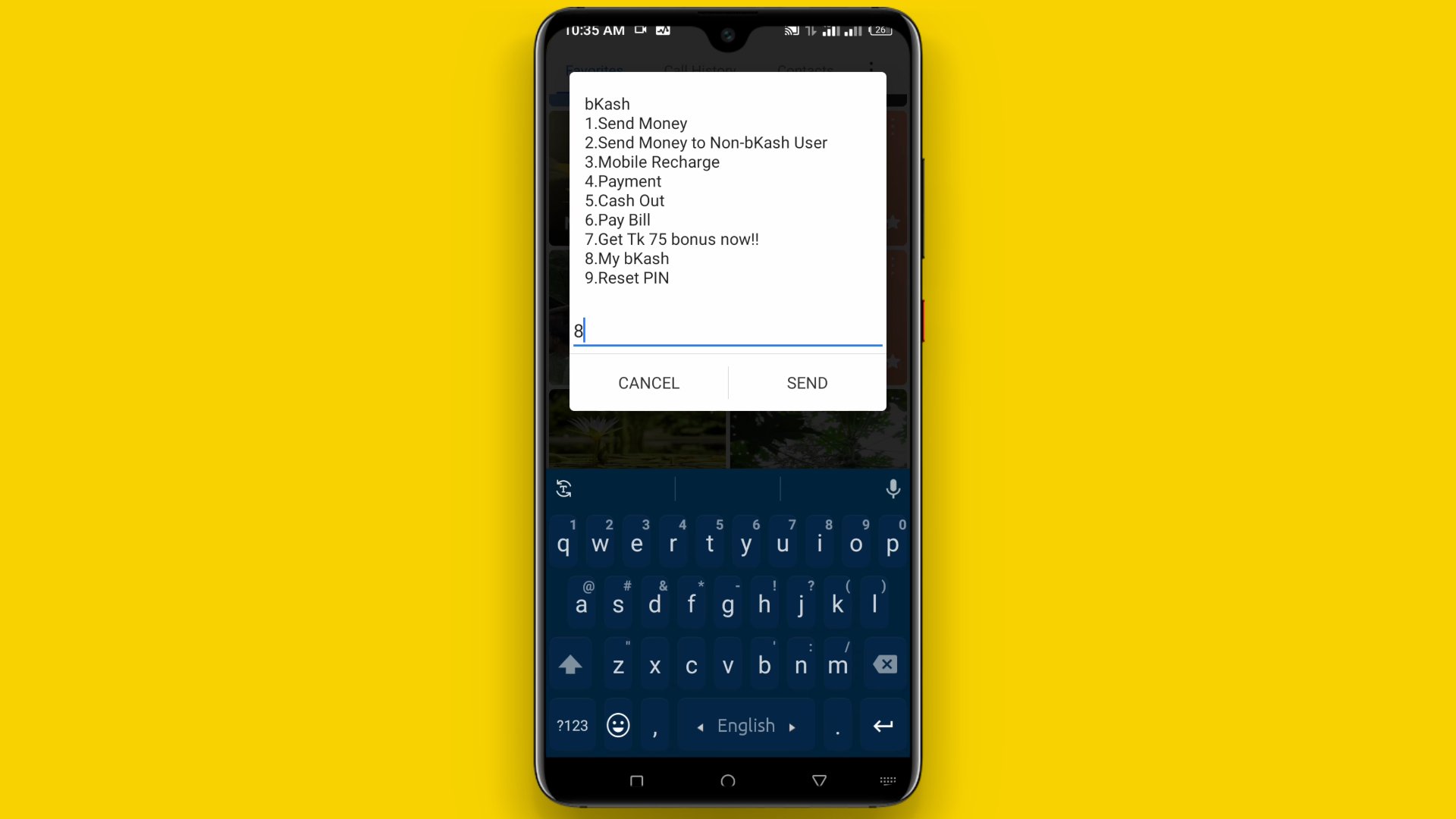 ২. এরপর বিকাশের মেনু থেকে আপনাকে My BKash অপশনটি সিলেক্ট করতে হবে। এজন্য আপনাকে ৮ তুলে Send করতে হবে।