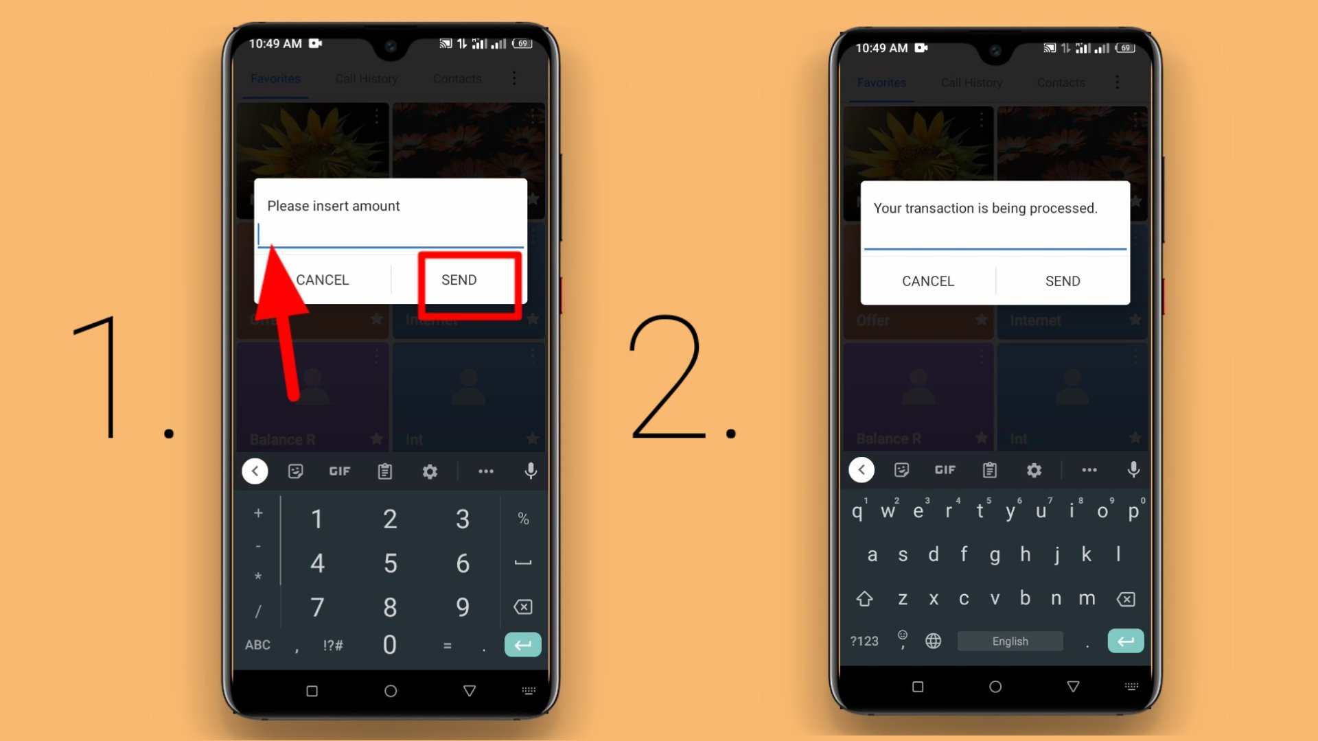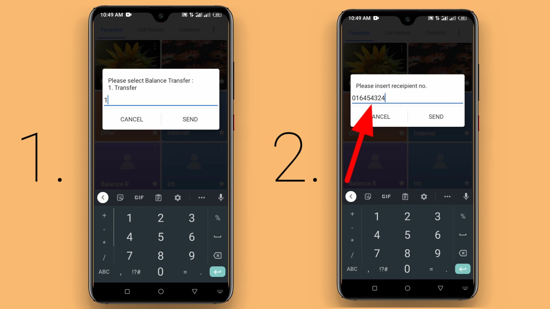 তারপরের অপশনে আপনাকে একটি এয়ারটেল নাম্বার দিতে বলবে। এই অপশনে আপনাকে অবশ্যই একটি এয়ারটেল প্রিপেইড নাম্বার দিতে হবে। কেননা শুধুমাত্র এয়ারটেল প্রিপেইড নাম্বারগুলোতে ব্যালেন্স ট্রান্সফার হবে। পরের অপশনে অর্থাৎ নিচের চিত্রের দ্বিতীয় নাম্বার ছবিতে দেখানো অপশনে আপনার নাম্বার দেবার পর send লেখার উপর ক্লিক করবেন।