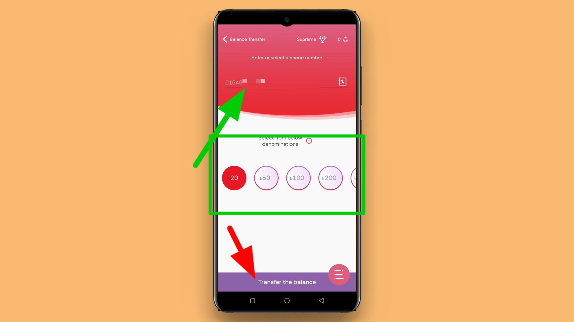 ২. এবার এখান থেকে ব্যালেন্স ট্রান্সফার করার অপশন-এ নিয়ে আসবে। এখানে উপরে আপনি দেখতে পাবেন নাম্বার দেওয়ার অপশন। এখানে আপনি যে নাম্বারে ব্যালেন্স ট্রান্সফার করবেন সেই নাম্বারটি দিয়ে দিবেন। তারপর নিচে রয়েছে এমাউন্ট সিলেক্ট করার অপশন। যেখানে আপনি ২০, ৫০, ১০০, ২০০, ৫০০ টাকা সিলেক্ট করতে পারবেন।