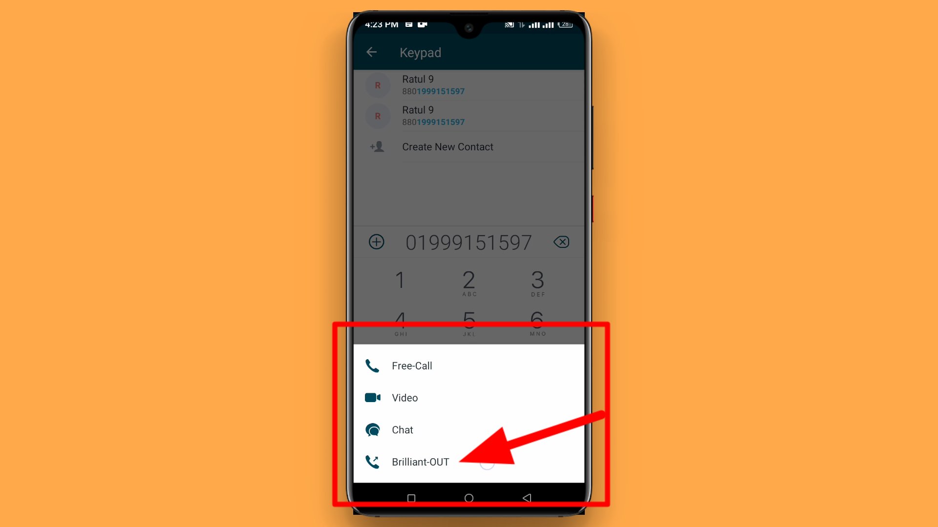 ১. ব্রিলিয়ান্ট অ্যাপ থেকে কাউকে ফোন দেবার জন্য নিজের contract list-এ গিয়ে যেকোনো একটি নাম্বার সিলেক্ট করে নিন যাকে আপনি ফোন দিবেন। সেই নাম্বারের উপর ক্লিক করার পর 'Brilliant-out' এ ক্লিক করলে সেই নাম্বারে কল চলে যাবে।