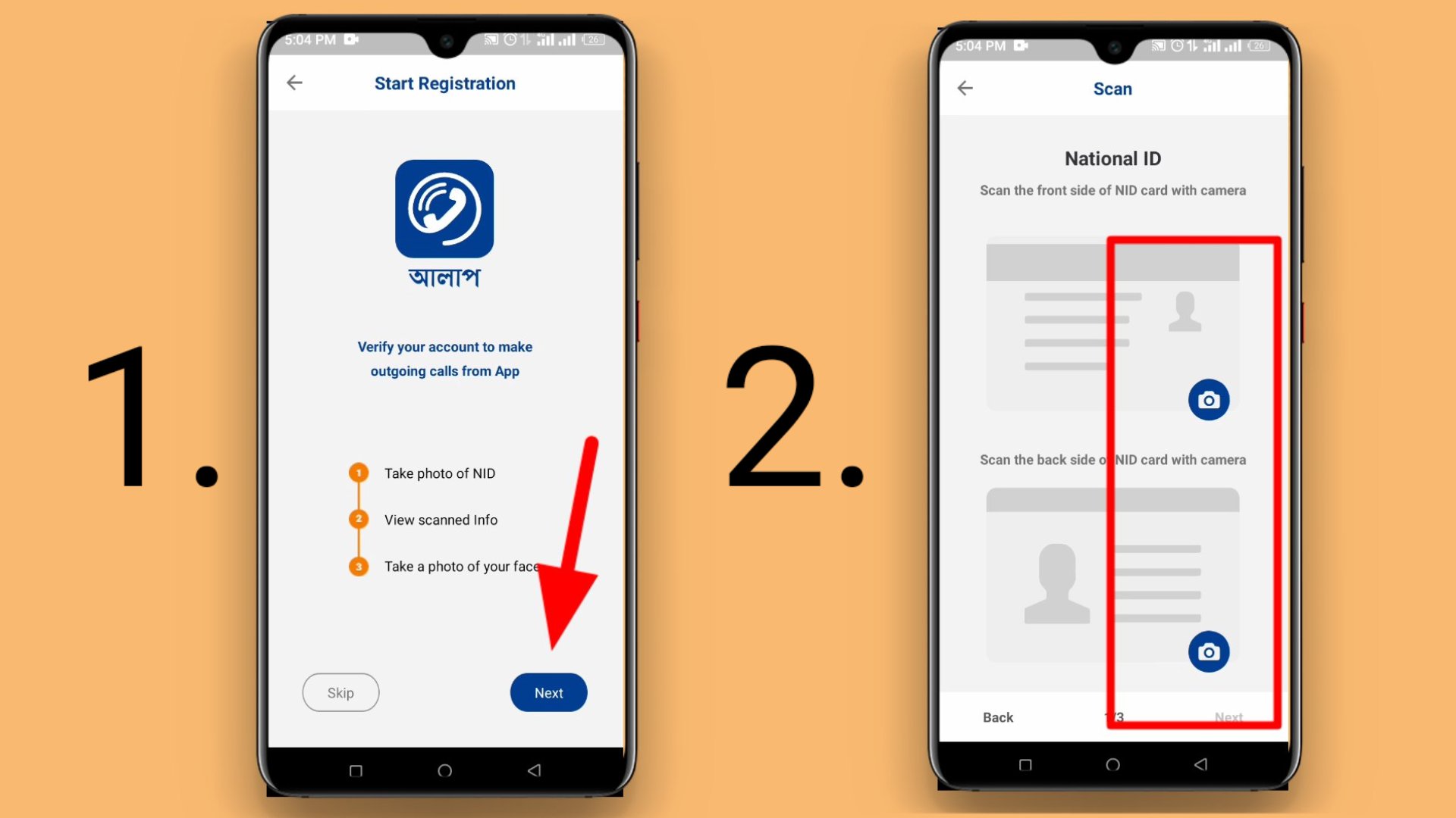 অ্যাকাউন্ট ভেরিফিকেশন করার জন্য আপনি এখানে নিচের 'Next' লেখাতে ক্লিক করবেন। তারপর আপনাকে দ্বিতীয় চিত্রের মত একটি পেজ এ নিয়ে আসবে। যেখানে আপনাকে এনআইডি কার্ডের ফ্রন্ট সাইড এবং ব্যাক সাইডের ছবি তুলতে বলা হবে। যে ছবিগুলো আপনি সরাসরি তুলে অথবা মোবাইলে সেভ করা থাকলে সেখান থেকেও দিতে পারেন।