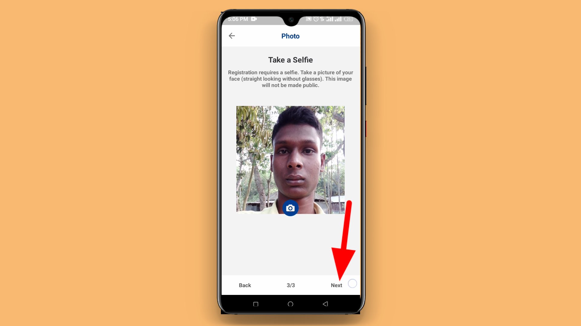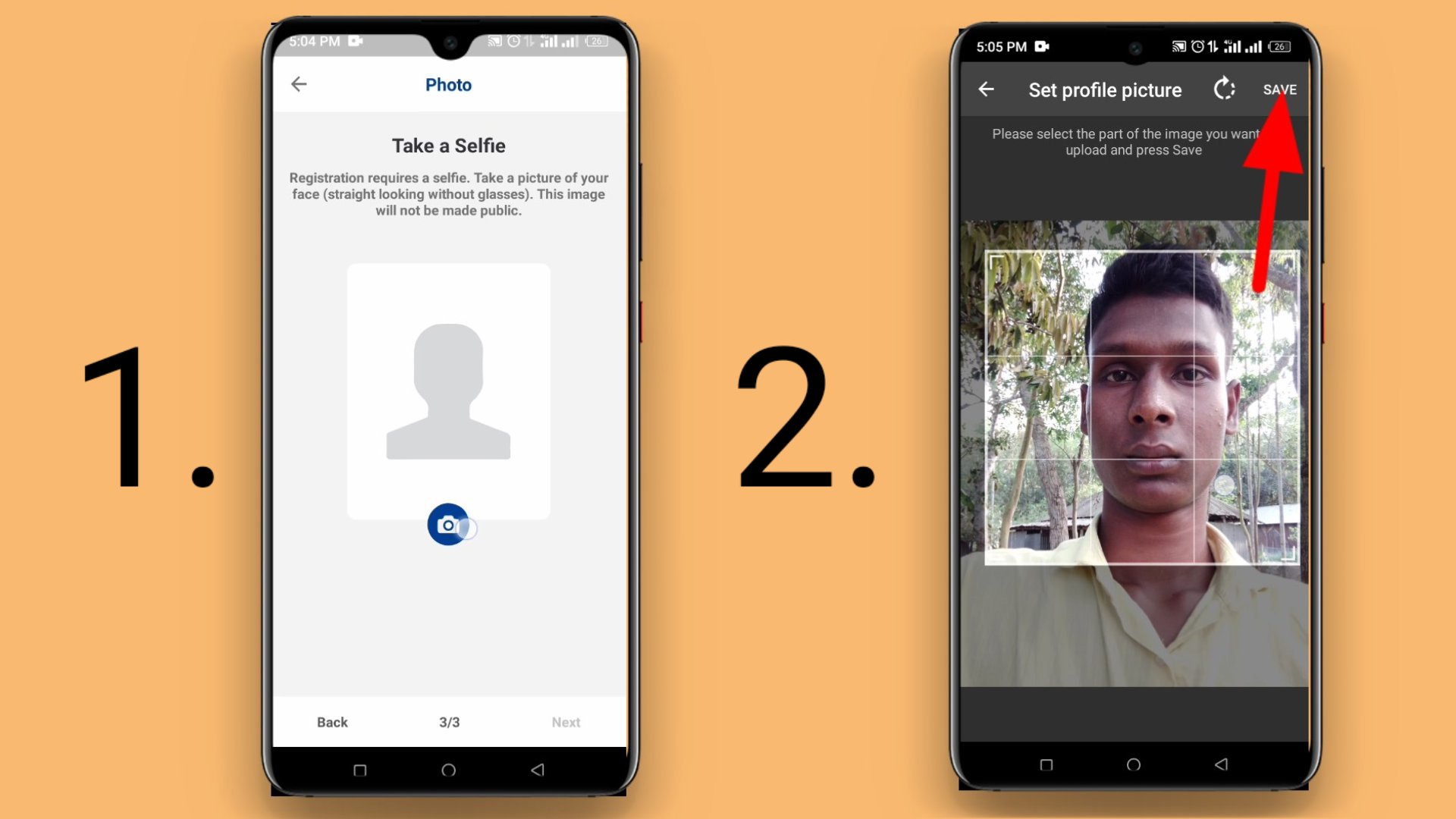 ৬. এবারের ধাপে আপনাকে একটি সেলফি তুলতে বলা হবে। যেখানে ক্যামেরা আইকনে ক্লিক করার পর একটি ছবি তুলে নিয়ে এবং সেটি crop করে উপরের save লেখাতে ক্লিক করবেন।