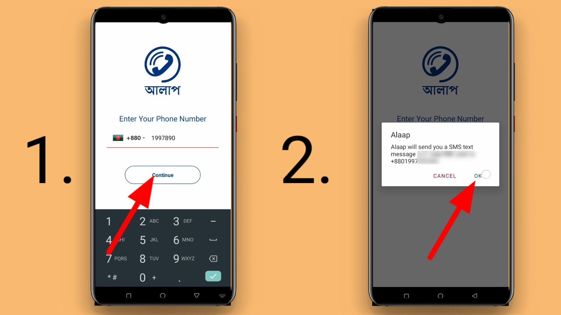 ২. এ ধাপে আপনাকে একটি নাম্বার দিতে হবে যে নাম্বারটি দিয়ে আপনি অ্যাপটি রেজিস্ট্রেশন করবেন। এবার এখানে আপনি আপনার সচল নাম্বারটি দিয়ে দিবেন। মোবাইল নাম্বারটি দেওয়া শেষ হলে নিচের continue-এ ক্লিক করবেন এবং তারপরের ধাপে ok-তে ক্লিক করবেন।