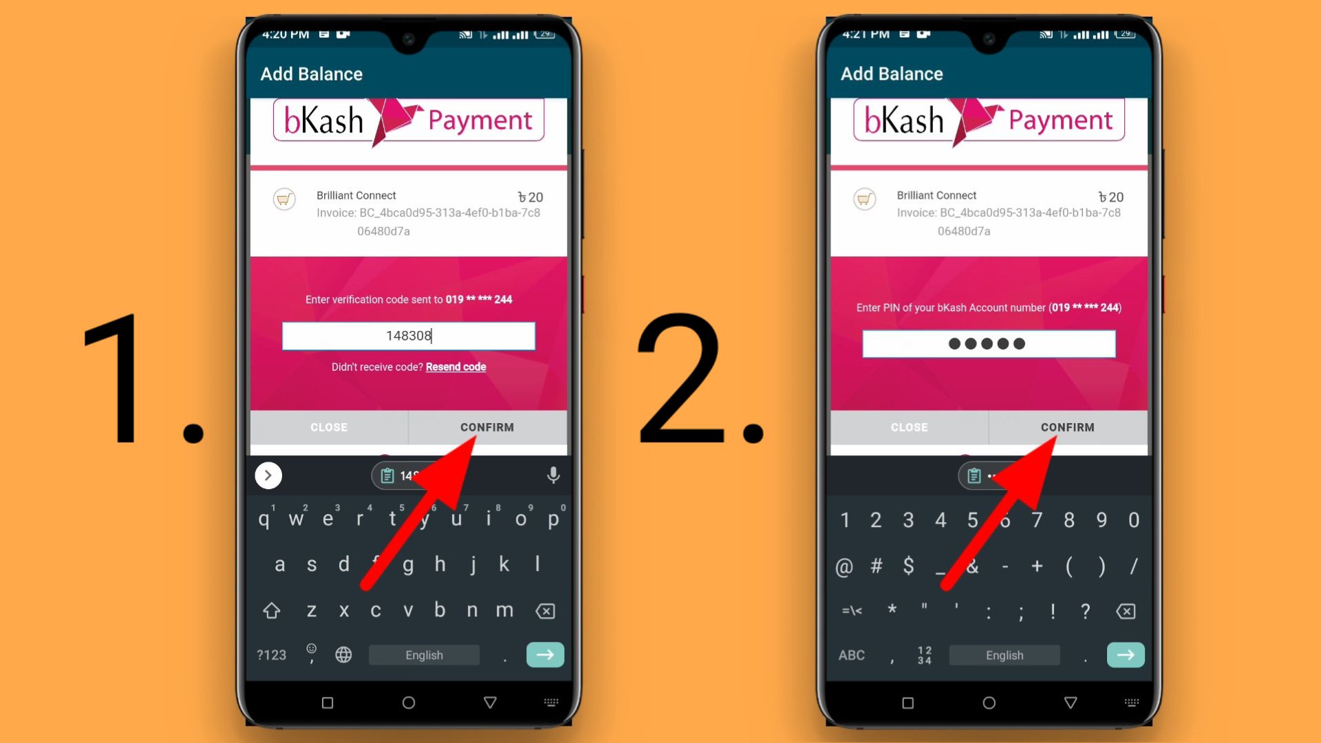৪. এর পরের ধাপে আপনার সেই বিকাশ একাউন্টে একটি ভেরিফিকেশন কোড যাবে এবং সেটি এখানে বসিয়ে দিয়ে নিচের 'confirm' লেখাতে ক্লিক করবেন। এর পরের ধাপে নিচের দ্বিতীয় চিত্রের মত করে পিন নাম্বার দিয়ে পুনরায় 'confirm'লেখাতে ক্লিক করুন। এবার আপনার ব্রিলিয়ান্ট একাউন্টে সেই টাকাটি অটোমেটিক যুক্ত হয়ে যাবে। এছাড়াও বাটন মোবাইল থেকেও কোড ডায়াল করে তাদের নাম্বারে পেমেন্ট করে তারপর সেই ট্রানজেকশন আইডি গুলো দিয়ে আপনার একাউন্টে টাকা নিতে পারেন। যে প্রক্রিয়াটি আমি এ পর্বে দেখাই নি। এটি আপনারা সেখান থেকে দেখে নিবেন।