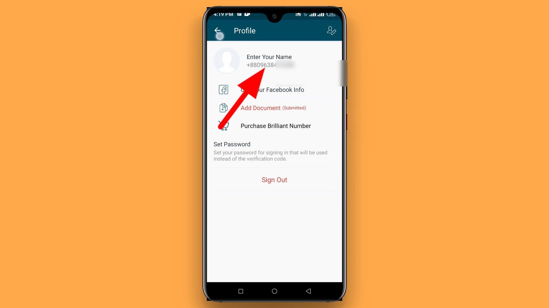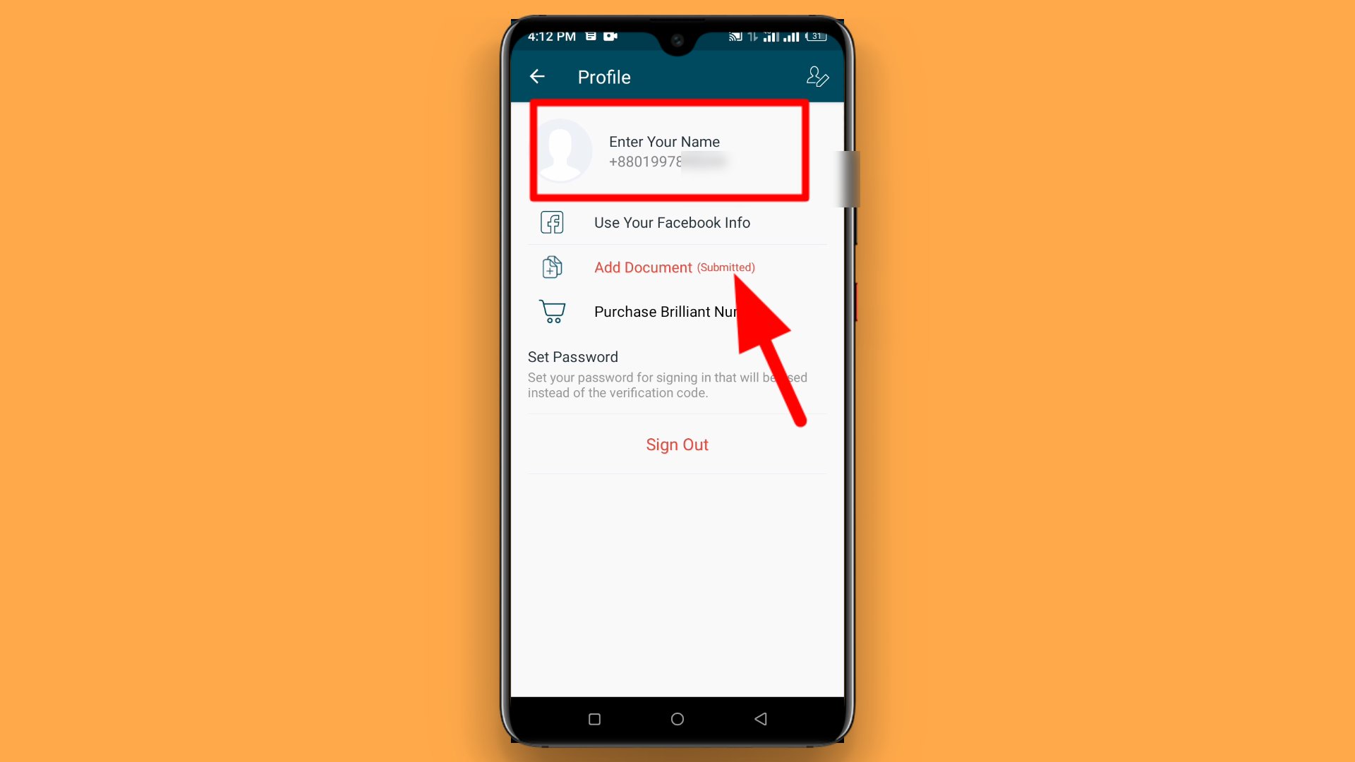 ১. এনআইডি কার্ড দিয়ে একাউন্ট ভেরিফিকেশন করার জন্য অ্যাপ এর ভিতরে উপরের সেটিং আইকনে ক্লিক করতে হবে। তারপর এখানে উপরে দেখতে পাবেন 'Enter Your Name' এর নিচে আপনার নাম্বারটি প্রদর্শিত হচ্ছে, যে নাম্বারটি দিয়ে আপনি ব্রিলিয়ান্ট অ্যাকাউন্টটি রেজিস্ট্রেশন করেছিলেন। আপনি এবার এখানে ক্লিক করবেন।