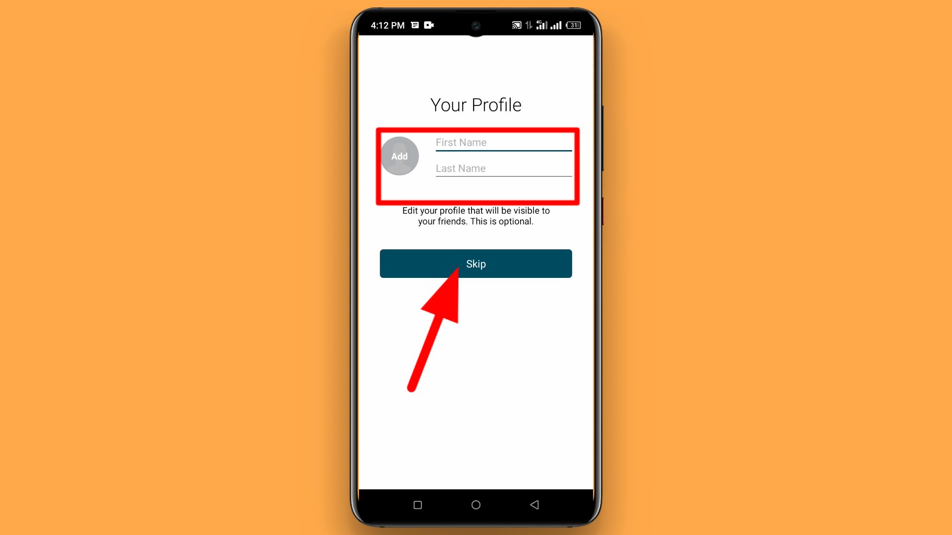 ৫. এর পরের ধাপে আপনাকে নিয়ে আসবে আপনার প্রোফাইল নাম দেবার অপশনে। এখানে আপনি চাইলে আপনার নামটি লিখে দিতে পারেন অথবা না চাইলে আপনি নিচের 'skip' লেখাতে ক্লিক করে পরের ধাপে যেতে পারেন। তবে এখানে আপনি যদি কোন নাম দেন তবে অবশ্যই সেটি ভোটার আইডি কার্ড অনুযায়ী দিয়ে দিবেন। এছাড়া এ নামটি আপনি পরবর্তীতেও দিতে পারবেন, আপনি অ্যাপটি দ্বিতীয় বার ইন্সটল করে যখন লগইন করবেন তখন এটি দেওয়ার অপশন আসবে। আপনি চাইলে পরবর্তীতে ও সেটি দিয়ে দিতে পারেন।