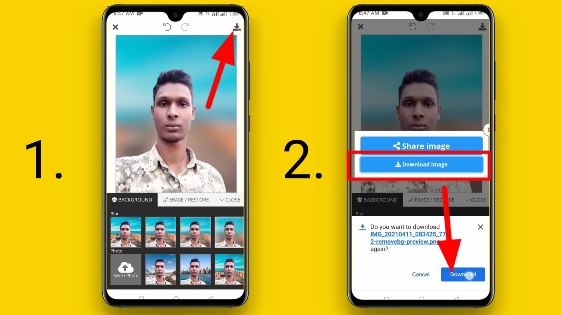 ৪. ছবি থেকে ব্যাকগ্রাউন্ড রিমুভ করে দেওয়ার পর আপনি চাইলে সেই ছবিটিকে ডাউনলোড করে নিতে পারেন যদি আপনার ব্যাকগ্রাউন্ড মুক্ত ছবির প্রয়োজন পড়ে। অনেক সময় আমাদের বিভিন্ন লোগো কিংবা কোন বস্তুর ব্যাকগ্রাউন্ড মুক্ত ছবির প্রয়োজন পড়ে। আপনার যদি ব্যাকগ্রাউন্ড মুক্ত ছবির প্রয়োজন পড়ে তবে নিচের Download-এ ক্লিক করে সেটি ডাউনলোড করে রেখে দিতে পারেন।