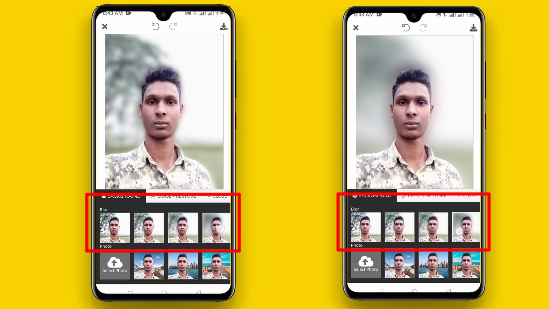 ৫. এবার আপনার ফটো এর ব্যাকগ্রাউন্ড ডিএসএলআর ক্যামেরার মত ঝাপসা করার জন্য এখানে প্রথমেই কিছু অপশন দেখতে পাবেন। যেগুলোতে ক্লিক করার মাধ্যমে আপনার ছবিটির ব্যাকগ্রাউন্ডকে প্রয়োজনমতো ঝাপসা করে নিতে পারবে। এখানে খুব নিখুঁতভাবে আপনার ছবির ব্যাকগ্রাউন্ড ঝাপসা হয়ে যাবে। আপনার ছবিটির কোয়ালিটি যদি ভালো হয় এবং এখান থেকে যদি আপনি ছবিটির ব্যাকগ্রাউন্ড ঝাপসা করে নেন তবে দেখে বোঝার উপায় নেই যে এই ছবিটি মোবাইল দিয়ে তোলা নাকি কোন ডিএসএলআর ক্যামেরা দিয়ে তোলা।