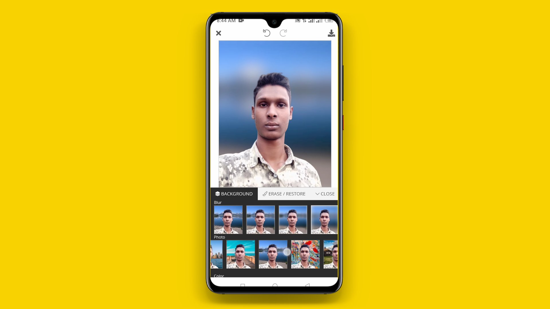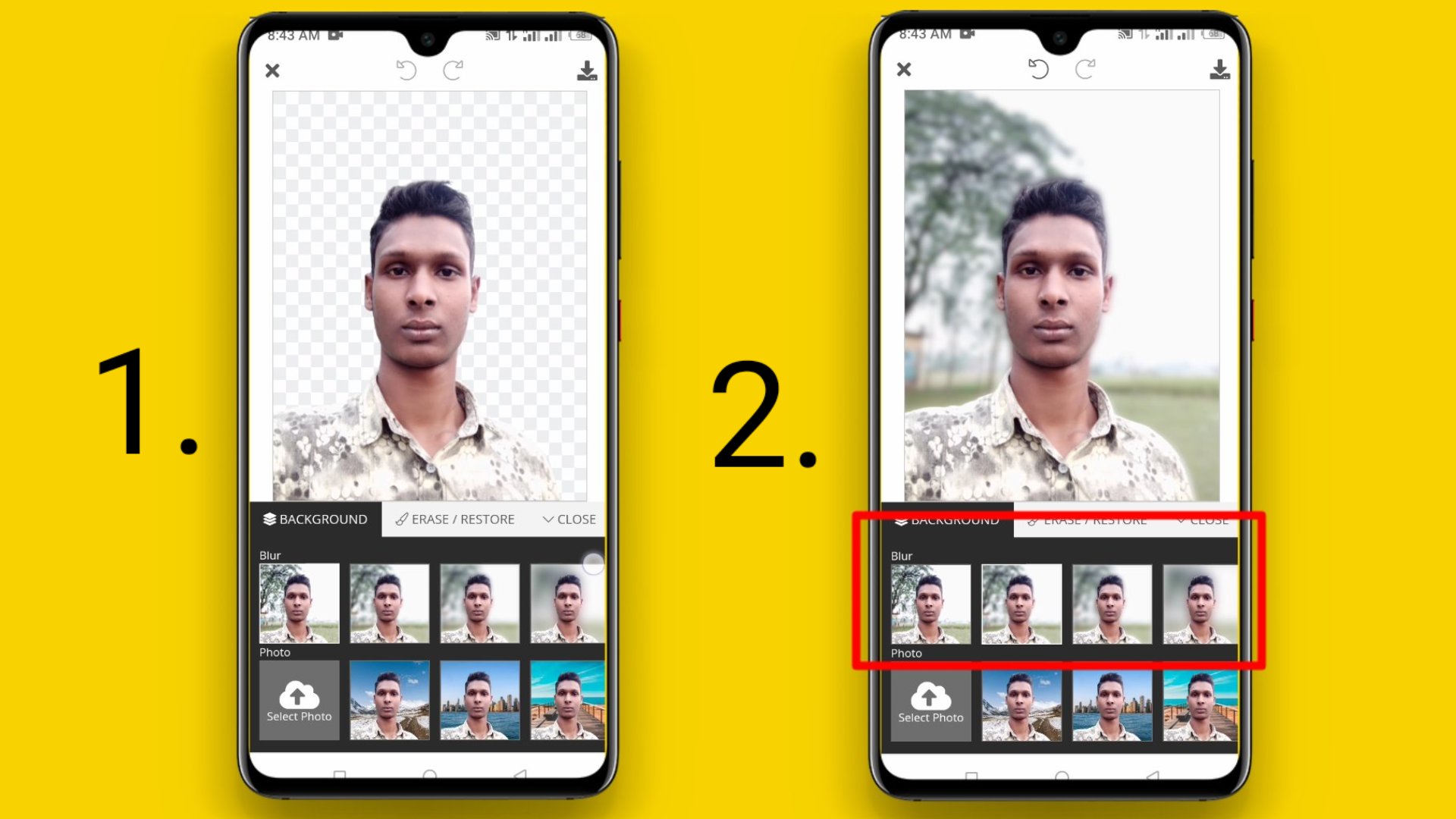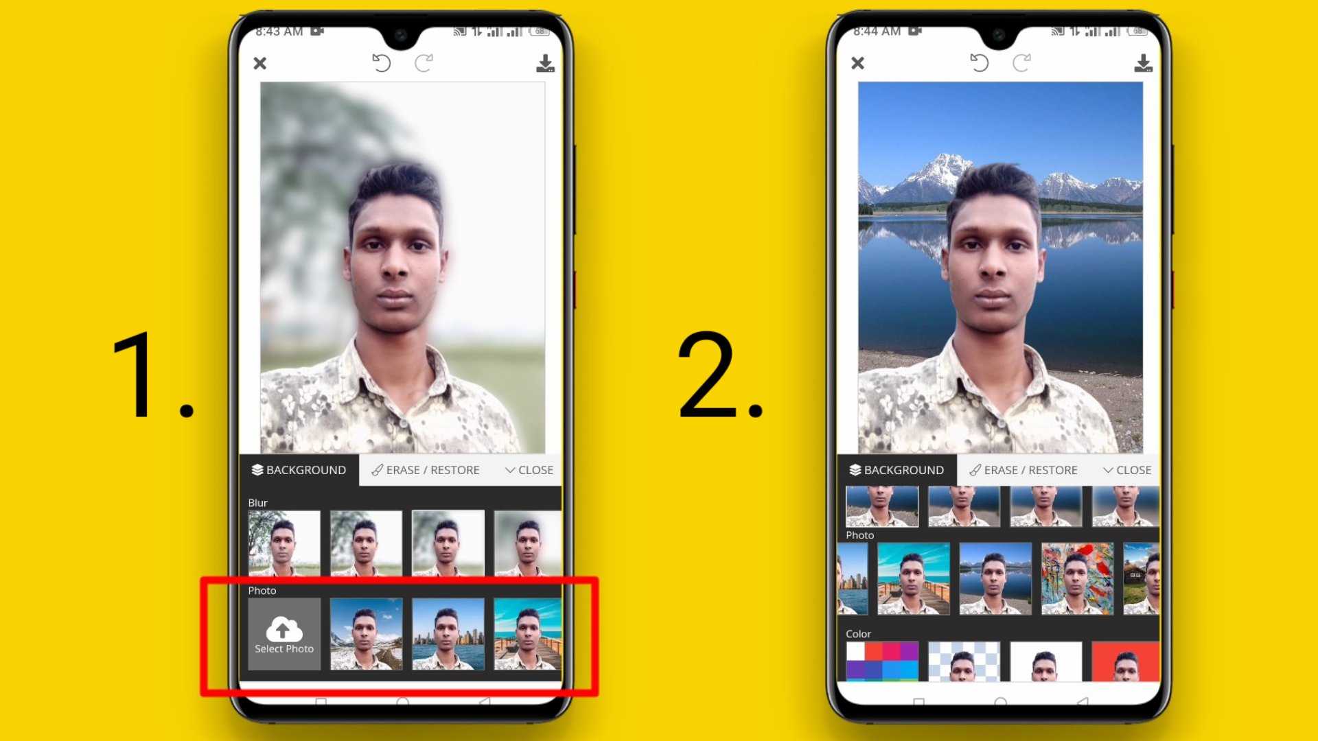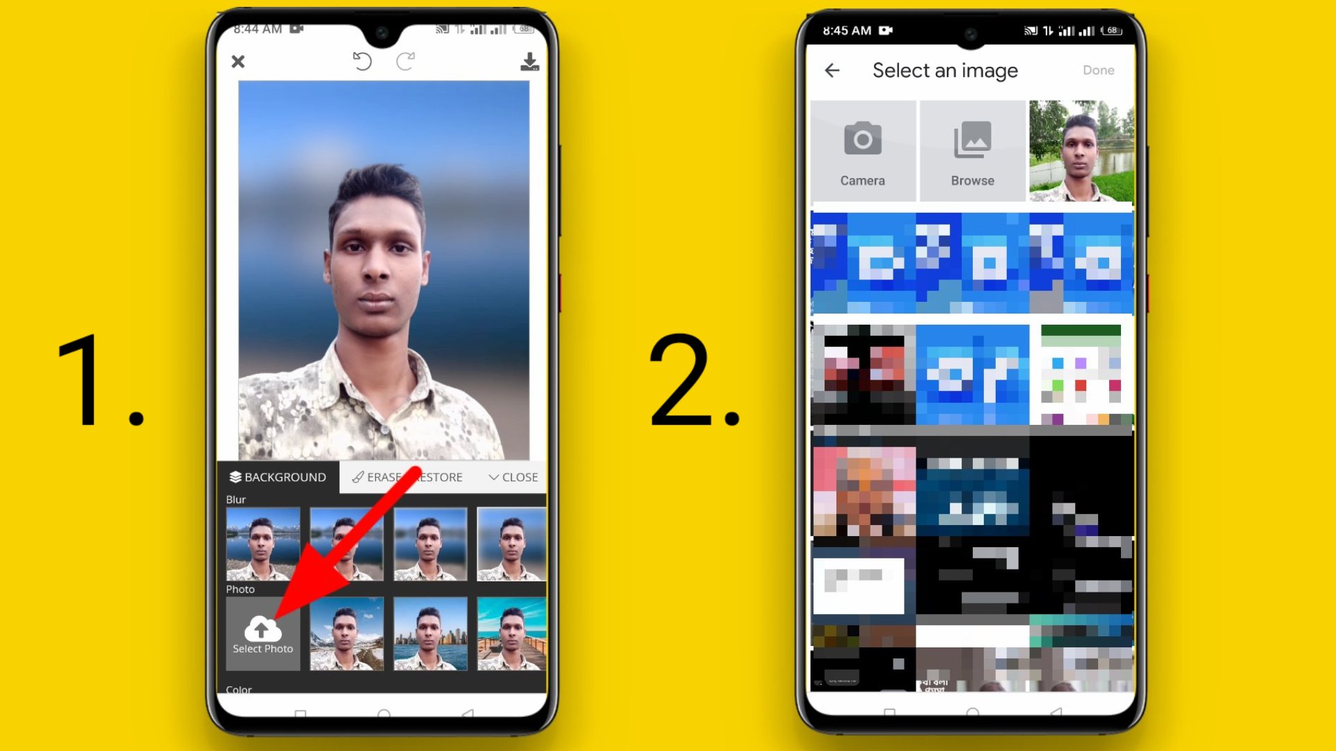 ৯. নিজের ছবির ব্যাকগ্রাউন্ড-এ ইচ্ছামত ছবি যোগ করার জন্য নিচের প্রথম চিত্রে দেখানো জায়গায়় 'Select Photo' অপশনে ক্লিক করতে হবে। যেখান থেকে আপনাকে আপনার মোবাইলের গ্যালারিতে নিয়ে যাবে এবং এখান থেকে আপনার ছবির ব্যাকগ্রাউন্ড এর জন্য যেকোনো একটি ফটো সিলেক্ট করে নিতে হবে। তো, আমি এখান থেকে একটি ফটো সিলেক্ট করে নেব, যেটি আমি আমার ছবিটি ব্যাকগ্রাউন্ড এ দিতে চাচ্ছি।