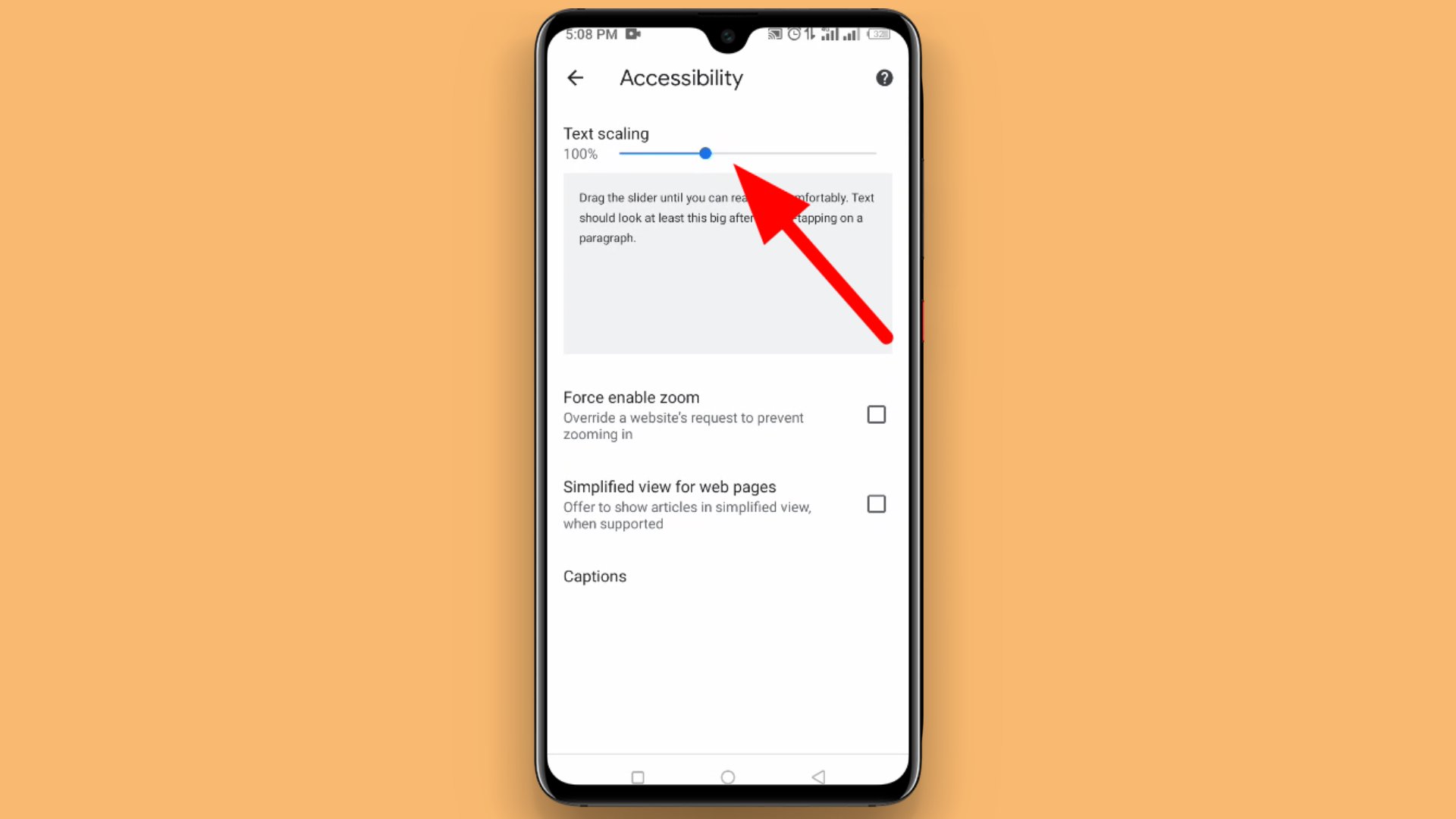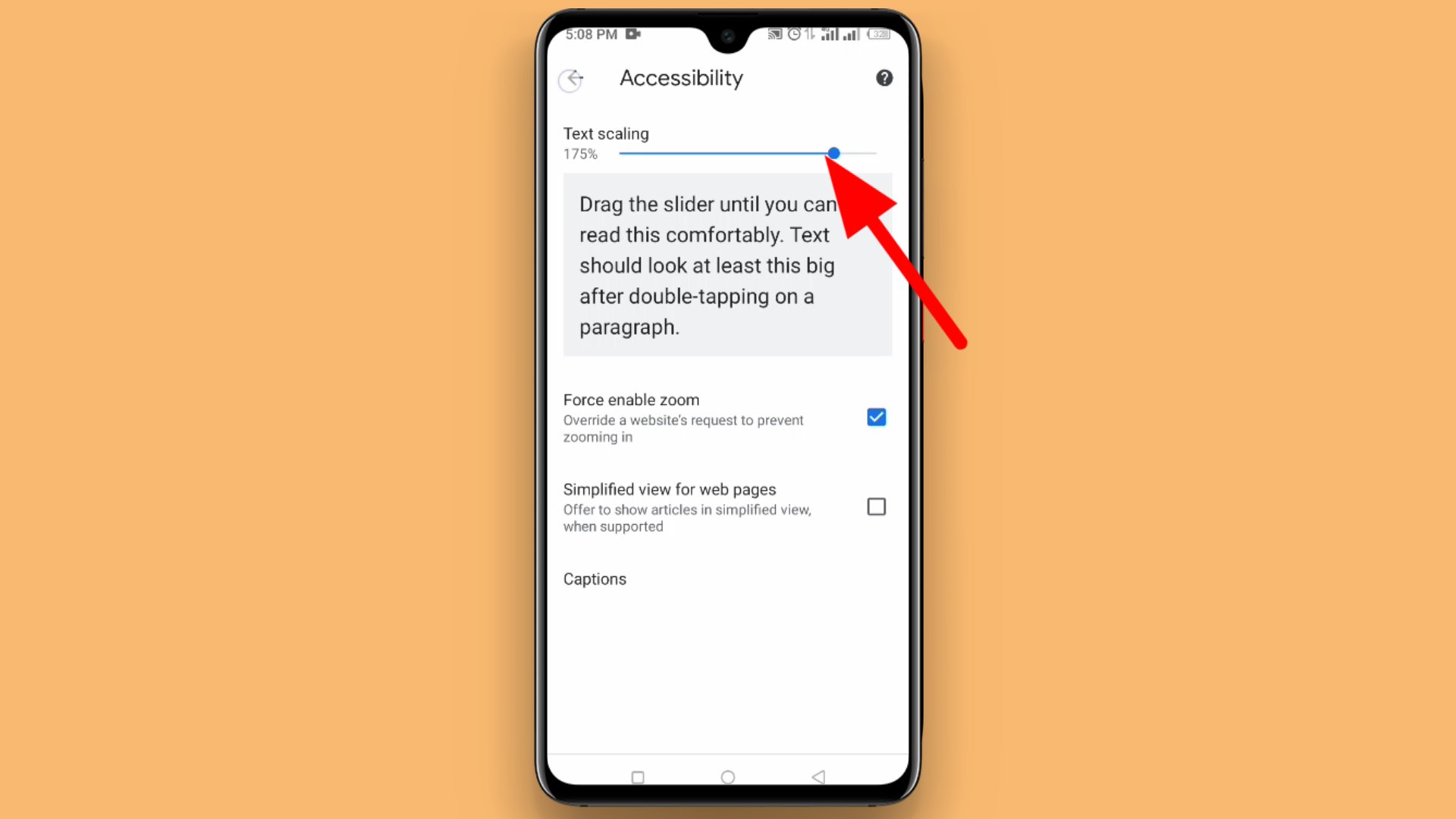 ৫. এবার এখান থেকে আপনার কাজ হবে আপনার প্রয়োজন অনুসারে ফ্রন্ট গুলোকে ছোট কিংবা বড় করে দেওয়া। এজন্য এখানে ট্যাপ করে ডান দিকে বাড়ালে ফ্রন্ট সাইজগুলো বড় হয়ে যাবে এবং এটিকে বামদিকে নিয়ে গেলে ফ্রন্ট সাইজগুলো ছোট হয়ে যাবে। এখানে আপনি ফ্রন্ট সাইজ গুলো বড় কিংবা ছোট করলে নিচে সেটির একটি নমুনা দেখতে পাবেন। এখানে আপনি font-size গুলোর নমুনা দেখার মাধ্যমে লেখা গুলোর সাইজ আগে থেকে নির্ধারণ করতে পারবেন। আমি এখানে Text scaling এর জায়গায় 175% করে দিলাম।