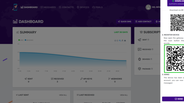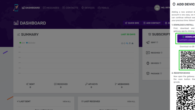 ৬ষ্ঠ ধাপ: এখন কম্পিউটার থেকে (ঘাসফরিং এসএমএস) ড্যাসবোর্ড এ লগিন করে অ্যাড ডিভাইস বাটনে ক্লিক করে (২নং অপশন) রেজিস্টার ডিভাইস কিউআর কোড আপনার মোবাইল দিয়ে স্ক্যান করুন। ব্যাস, আপনার অ্যানড্রইড মোবাইল কানেক্ট হয়ে যাবে।