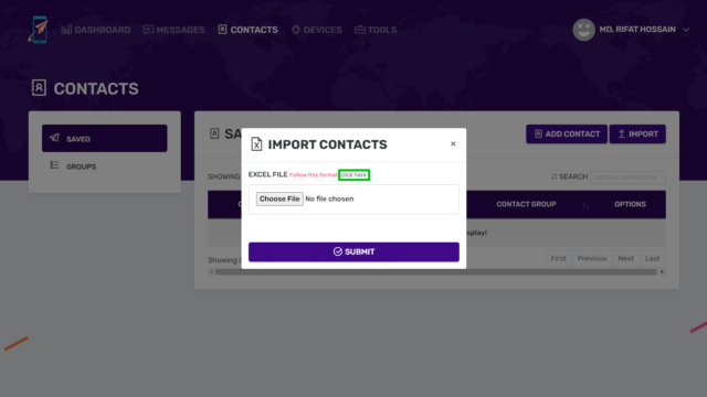 আপনার ফাইল তৈরী হয়ে গেল, এবার ফাইল ইমপোর্ঠ করুন। মেনু থেকে কন্টাক্ট ক্লিক করুন, বাম পাশে সেভড বাটনে ক্লিক করুন, এরপরে ইমপোর্ট বাটনে ক্লিক করুন, চয়েস ফাইল বাটনে ক্লিক করুন, সাবমিট বাটনে ক্লিক করুন। আপনার লিস্টেড নাম্বার আপলোড হয়ে গেল। এখন বাল্ক এসএমএস সেন্ড করুন।