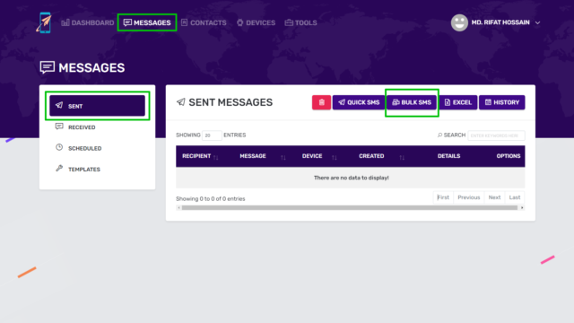 ৯ম ধাপ: বাল্ক এসএমএস সেন্ড করার জন্য হেডার থেকে ম্যাসেস এ ক্লিক করুন, বাম পাশ থেকে সেন্ড বাটনে ক্লিক করুন, ডানপাশ থেকে বাল্ক এসএমএস এ ক্লিক করুন
