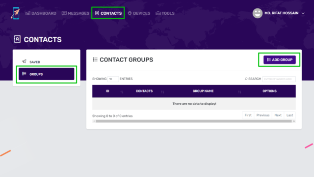 ৭ম ধাপ: এখন আপনি কুইক (সিঙ্গেল) এসএরমএস অথবা বাল্ক এসএমএস সেন্ড করতে পারবেন, আমরা দেখাবো, কিভাবে বাল্ক এসএমএস সেন্ড করবেন? বাল্ক এসএমএস সেন্ড করার জন্য আপনাকে একটি গ্রুপ ক্রিয়েট করতে হবে, নাম্বার লিস্ট আপলোড করে সেভ করে রাখার জন্য। একটি গ্রুপ ক্রিয়েট করুন।