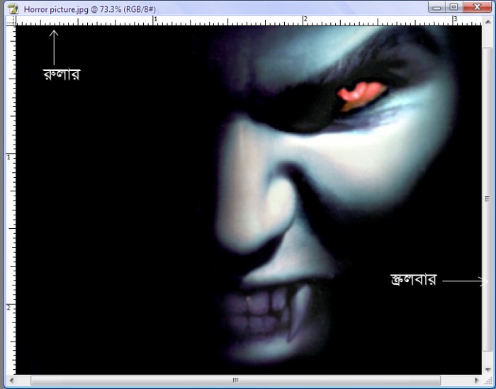 উইন্ডোর উপরে মেনুবারের নিচে এবং বাম দিকে রুলার প্রদর্শন করে সথিক মাপ নির্ধারণ করে কাজ করা যায়। রুলার প্রদর্শিত করার জন্য View > Rulers অথবা Ctrl+R চাপলেই রুলার প্রদর্শিত হবে।