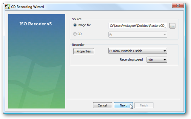 নতুন একটি উইন্ডো ওপেন হবে যেখানে ইমেজ ফাইলের সোর্স সহ কিছু তথ্য থাকবে, স্পিড সিলেক্ট করে Next এ ক্লিক করুন।