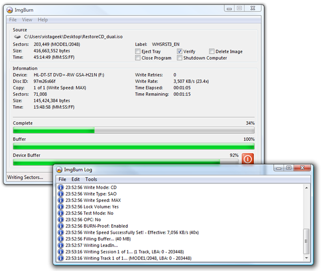 এবার সিডি রাইটিং প্রসেস শুরু হয়ে যাবে পাশাপাশি একটি লগ স্ক্রিন ওপেন হবে, যা আপনাকে সিডি রাইট করার সময়কার যাবতীয় তথ্যাদির লগ দিবে।