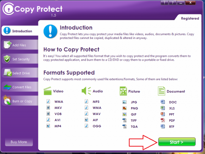 সফটওয়্যার টি ওপেন করলে নিচের ছবির মত আসবে। এখানে কিছু ফাইল এক্সটেনশন দেয়া আছে এই ফাইলগুলো এই সফটওয়্যার দ্বারা "কপি প্রটেক্ট" করা সম্ভব। তাই এক্সটেনশন গুলো মনে রেখে "Start" বাটনে ক্লিক করুন।