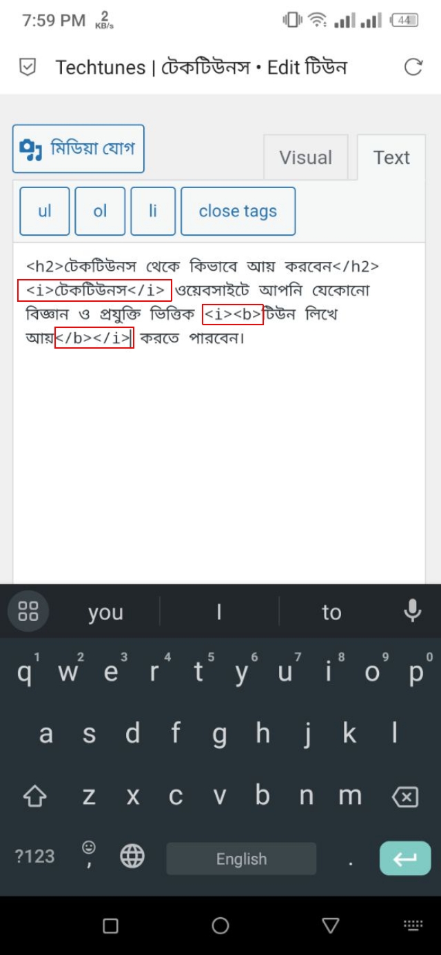 ৪. আর, কোন একটি লেখাকে ইটালিক করার জন্য শুধুমাত্র সামনে এবং পেছনে <i></i> বসিয়ে দিবেন। উদাহরণস্বরূপ, আমি যদি এখানে থাকা প্রথমের "টেকটিউনস" শব্দটিকে ইটালিক করতে চাই, তাহলে আমি ”টেকটিউনস” লেখাটিকে ইটালিক করার জন্য <i>টেকটিউনস</i> কোডটি ব্যবহার করব। আপনি যদি কোন একটি লেখাকে একই সাথে বোল্ড এবং ইটালিক করতে চান, তাহলে আপনি দুইটি এইচটিএমএল ট্যাগ ই ব্যবহার করবেন। যেমনটি আমি, এখানে "টিউন লিখে আয়" লেখাটির ক্ষেত্রে করেছি।