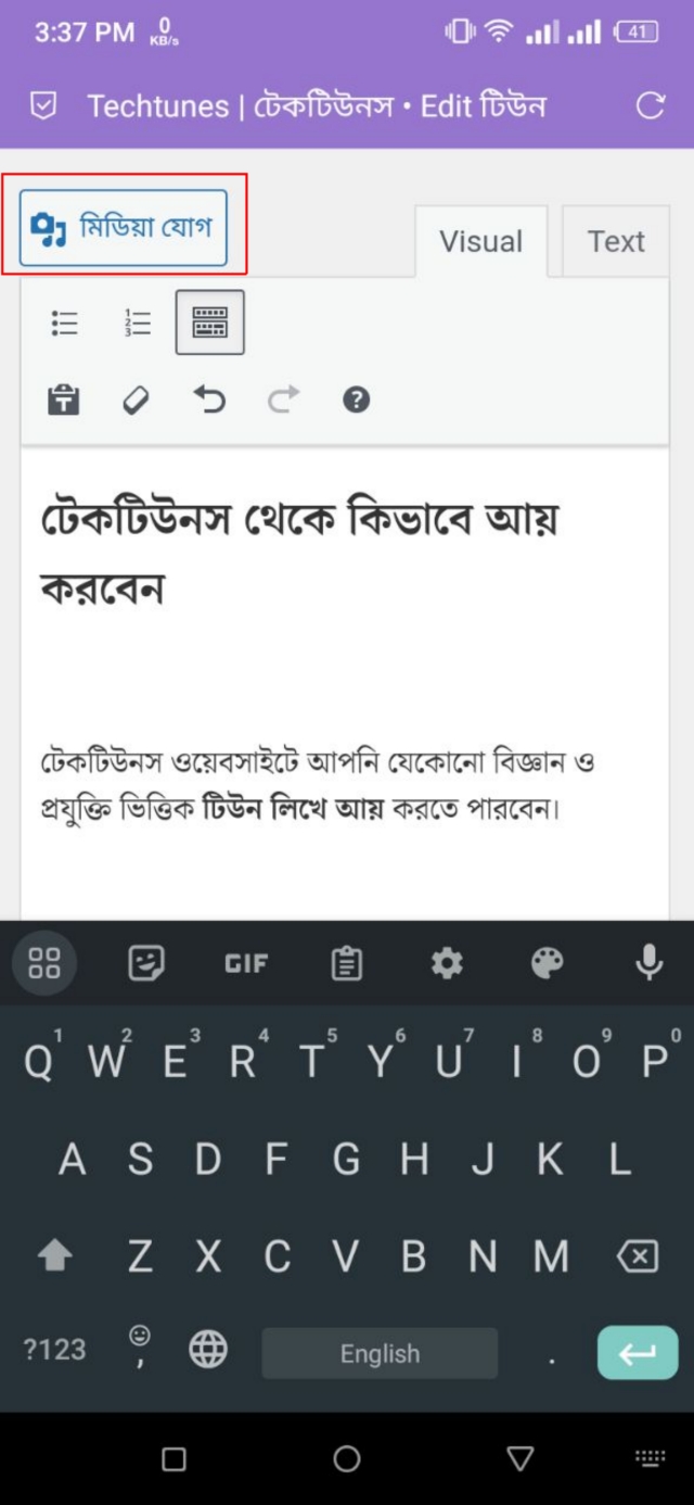 ১. এটি করার জন্য H2 হেডিং এর নিচে একটি Enter চেপে অতিরিক্ত জায়গা ফাঁকা করে নিন এবং তারপর "মিডিয়া যোগ" বাটনে ক্লিক করুন।