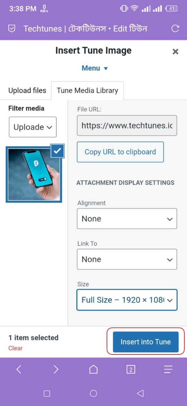 ৬. এগুলো সিলেক্ট করা হয়ে গেলে Insert into Tune বাটনে ক্লিক করে ছবিটি সংযুক্ত করুন।