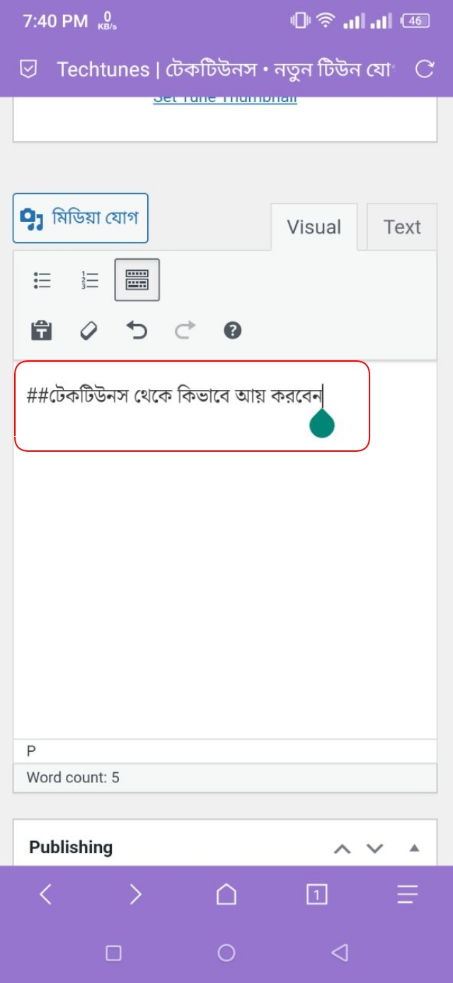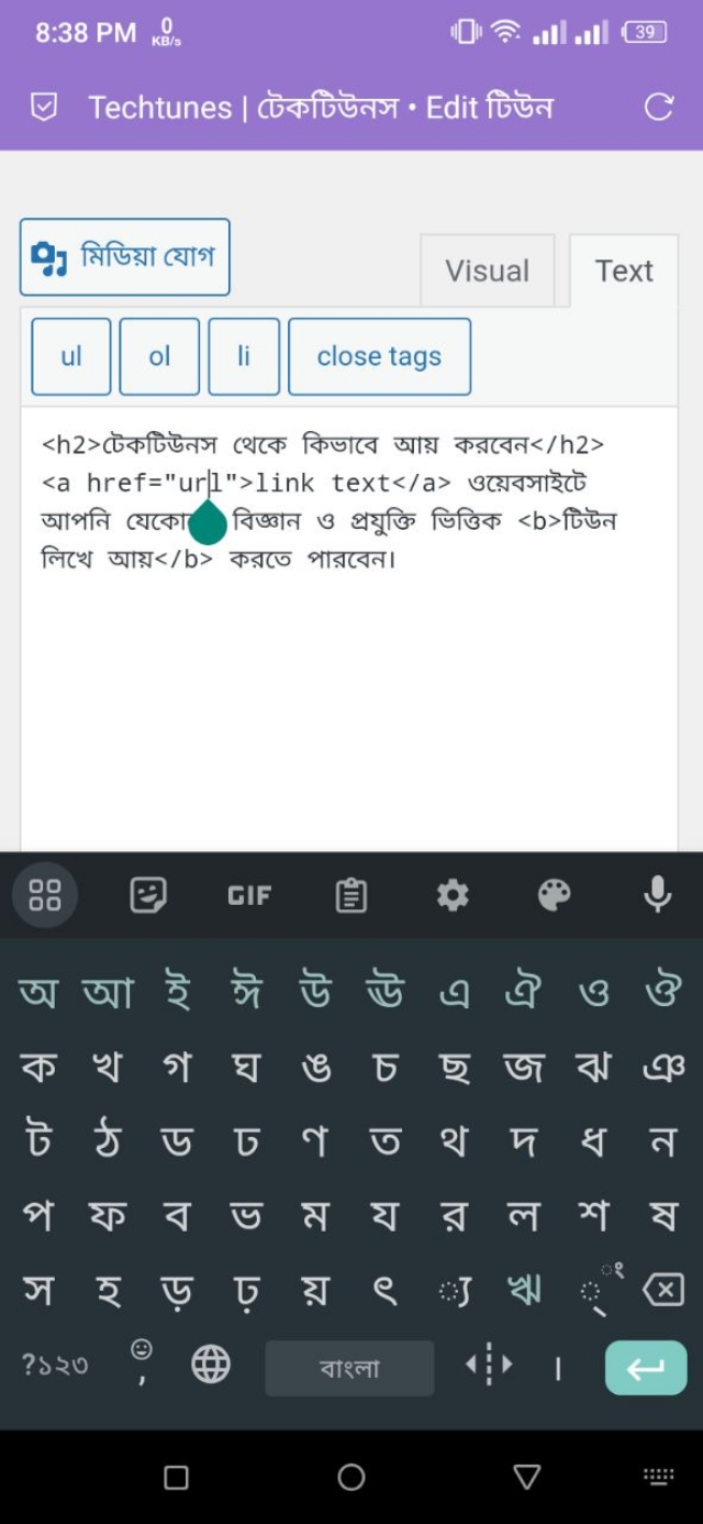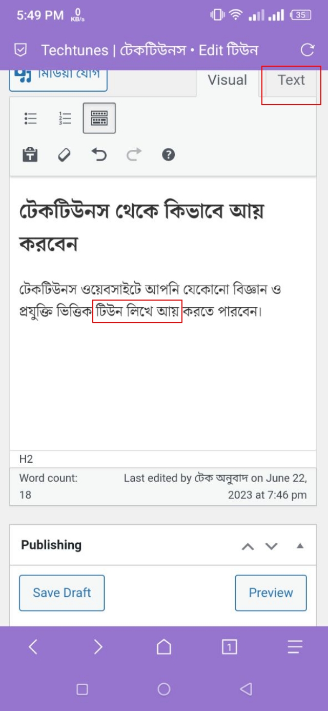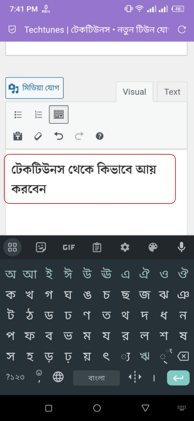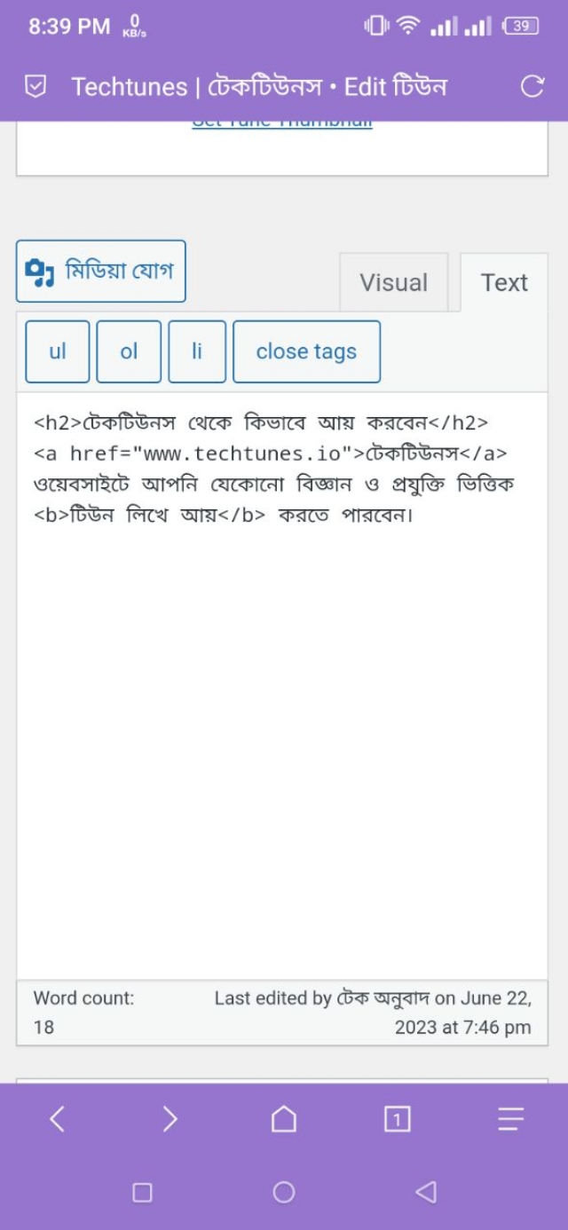 ১. উদাহরণস্বরূপ, আমি এখানে "টিউন লিখে আয়" লেখাটিকে বোল্ড করতে চাই। এখন, যেহেতু আমার টিউন এডিটরে এই লেখাটি বোল্ড করার অপশন নেই, তাই আমি এই লেখাটিকে বোল্ড করার জন্য HTML Code ব্যবহার করব। আর, এইচটিএমএল কোড ব্যবহার করে এই লেখাটি বোল্ড করার জন্য আমাকে উপরে থাকা Text অপশনটিতে ট্যাপ করতে হবে।