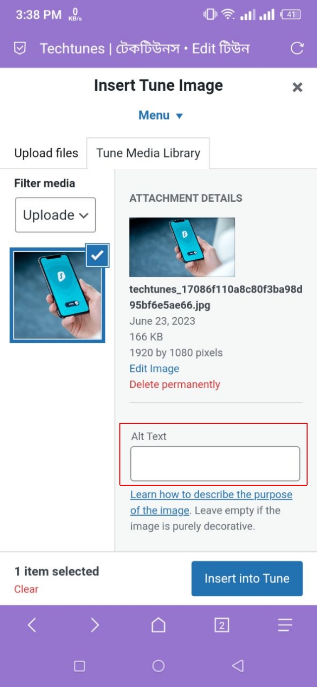 ৪. ছবিটি আপলোড হওয়া শেষ হলে, আপনি প্রয়োজন মত ছবিটির সম্পর্কে Alt Text লিখে দিন। এই ছবিটি কী সম্পর্কে, সেটি এখানে লিখতে হবে।