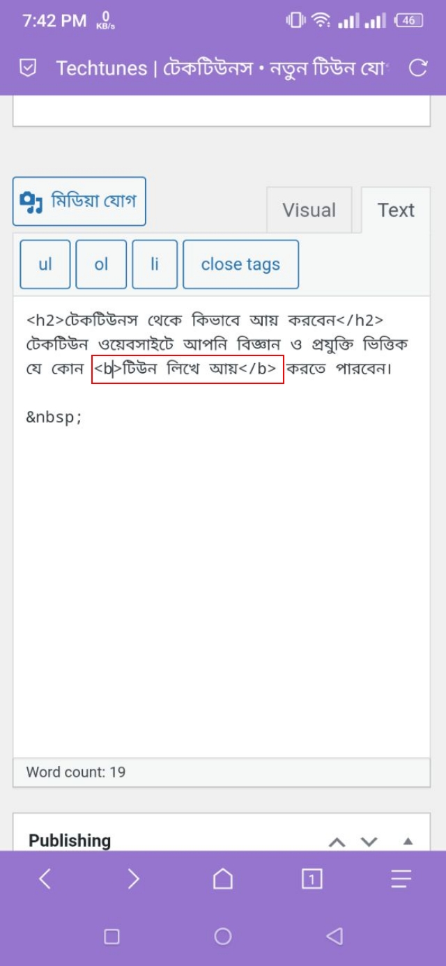 ২. এখানে আসার পর আমি যেহেতু "টিউন লিখে আয়" এই লেখাটিকে বোল্ড করতে চাই, তাই এটির সামনে এবং পেছনে HTML Tag বসিয়ে দিব। HTML কোডের মাধ্যমে কোন একটি লেখাকে বোল্ড করার জন্য <b></b> ট্যাগ ব্যবহার করতে হয়। এখন, এই লেখাটি বোল্ড করার জন্য আমাকে এটির সামনে এবং পেছনে এই HTML কোডটি বসিয়ে দিতে হবে।