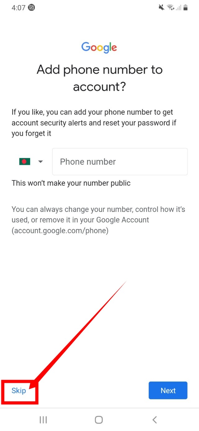 ১১. তারপর আপনার ফোন নাম্বার চাইবে। ফোন নাম্বার দেওয়া যদি বাধ্যতামূলক হয় তাহলে সেখানে স্কিপ করার অপশন থাকবে না আর যদি বাধ্যতামূলক না হয় তাহলে সেখানে স্কিপ করার অপশন থাকবে। তোর ফোন নাম্বার দাও বাধ্যতামূলক হলে সেখানে আপনার ফোন নম্বরটি দিন। স্কিপ করার অপশন থাকলে আপনি নম্বরটি দিতেও পারেন আবার নাও দিতে পারেন। তো আমি নম্বরটি না দিয়ে স্কিপ করলাম।