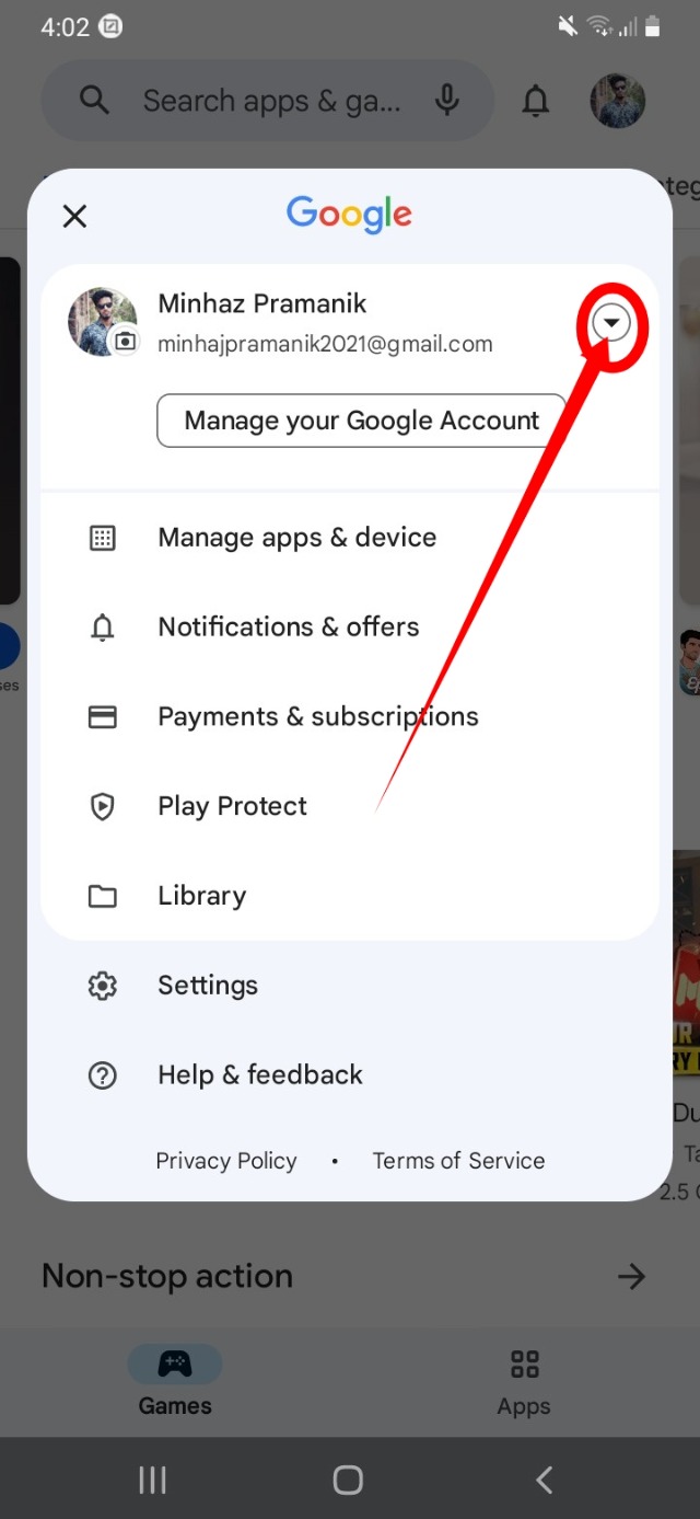 ৩. তারপরে আপনার জিমেইলের নামের ডান পাশের ড্রপডাউন মেনু তে ক্লিক করুন।