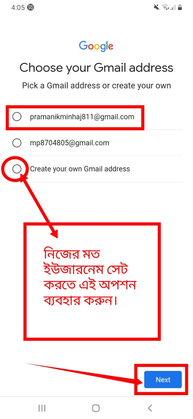 ৯. তারপর আপনার জিমেইলের জন্য যেকোনো একটি ইউজার নেম সিলেক্ট করুন। অথবা আপনি চাইলে নিচের অপশন ব্যবহার করে আপনার মন মতো করে একটি ইউজারনেম বসিয়ে ও দিতে পারেন। আমি সবার উপরের ইউজার নেমটি সিলেক্ট করলাম। ইউজার নেম সিলেক্ট করার পর আপনি নিচে নেক্সট বাটনে ক্লিক করবেন।