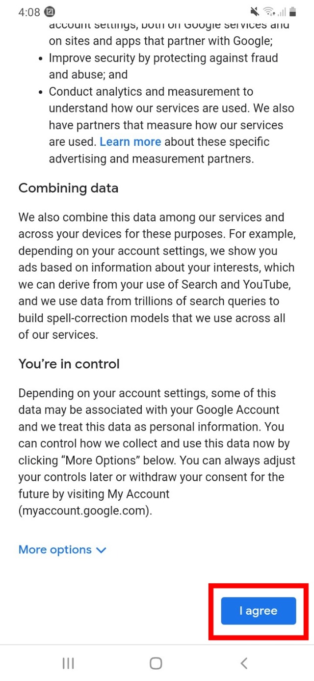 ১৩. তারপরে আপনাকে জিমেইলের নীতিমালা পেজে নিয়ে যাবে। তো সেখানে স্ক্রল করে সবার নিচে পর্যন্ত আসুন। এবং সবার নিচে আই এগ্রি লেখাতে ক্লিক করে দিন।