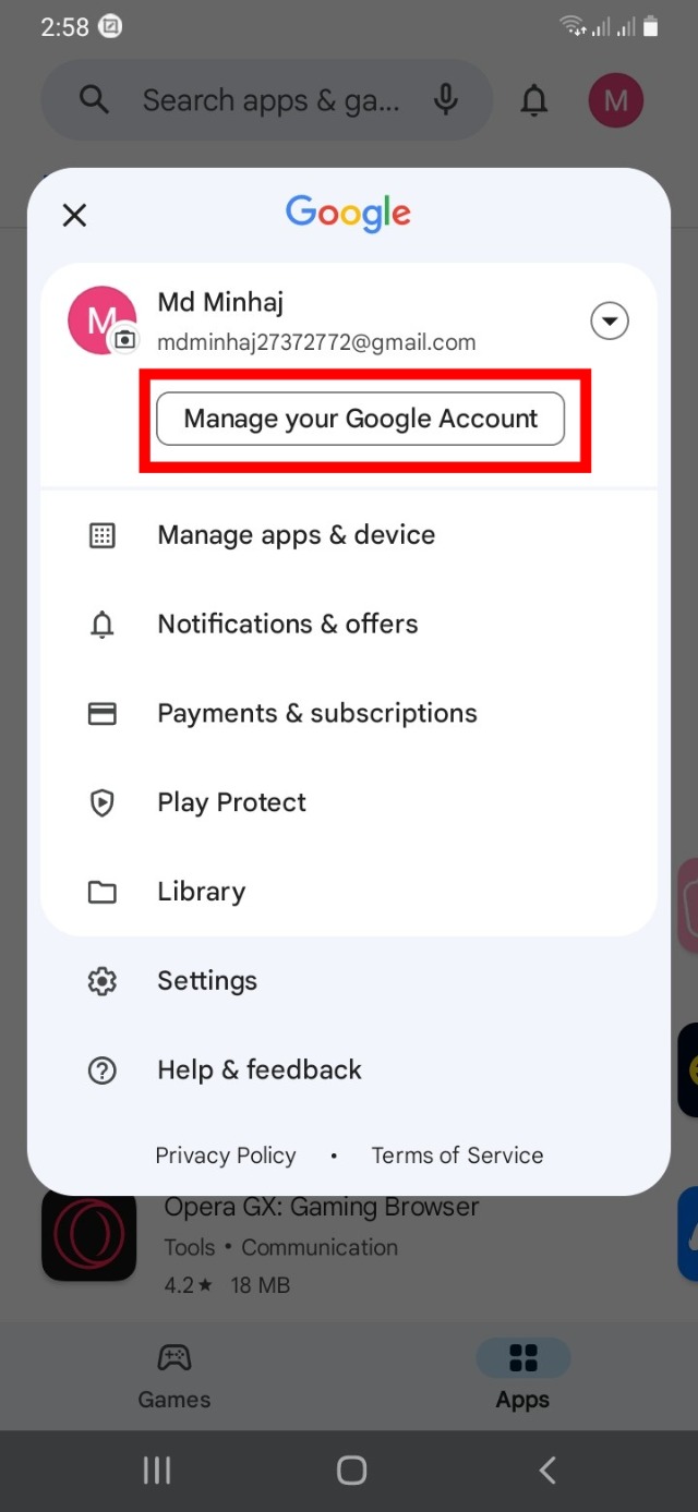 ৩. তারপর আপনার জিমেইলের ইউজারনেম এর একটু নিচে ইংরেজিতে লেখা "Manage Your Google Account" এ ক্লিক করুন।