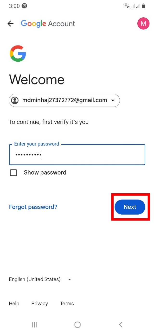 ৬. তারপর আপনার জিমেইলের বর্তমান যে পাসওয়ার্ডটি রয়েছে সেটি দিন। জিমেইলের বর্তমান পাসওয়ার্ড দেওয়ার পর নিচে ডান দিকে "Next" লেখাতে ক্লিক করুন।