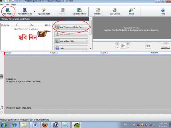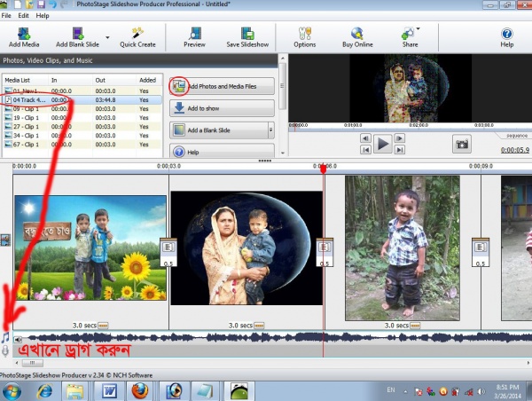 আপনার যে ছবিকে ভিডিওতে রূপান্তর করবেন, Add Photos and Media File বাটনে ক্লিক করে ছবি/ গান নির্বাচন করুন। যটা ছবিতে দিতে চান!