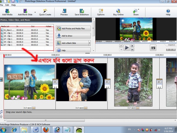 এবার Media List থেকে ছবিগুলো টেনে Timeline ফেলে দিন, এখন ছবির মধ্যে গান/শব্দ দিতে চাইলে। নিচের মত কাজ করুন।