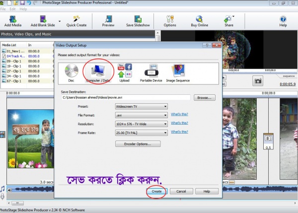 এখানে আপনি পিসি, ডিভিডি, সিডি অথবা অন্য কোনো মাধ্যমের জন্য ভিডিওটি রূপান্তর করতে চাইলে তা নির্বাচন করে দিন। সবশেষ Create এ ক্লিক করলে ভিডিওতে রূপান্তর করা শুরু করবে। কিছুক্ষণ অপেক্ষা করতে হবে এবং দেখবেন, ছবির প্রত্যাশিত ভিডিওটি যথাস্থানে Save হয়ে গেছে।