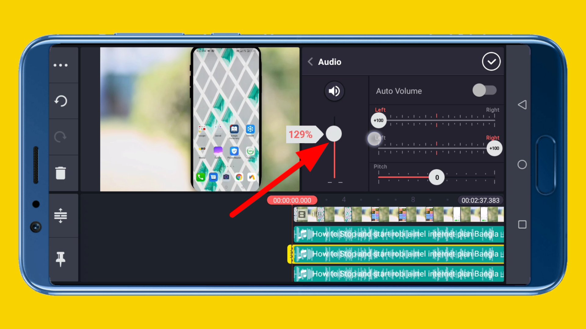 ১১. আর আপনি যদি আপনার ভিডিওর সাউন্ড কে সামান্য পরিমাণে বাড়িয়ে নিতে চান, তাহলে আপনি এখান থেকে কিছু শতাংশ সাউন্ড বাড়িয়ে নিলেই হবে। এক্ষেত্রে আপনাকে ভিডিও থেকে অডিও আলাদা করে সেই অডিও টিকে Duplicate করার প্রয়োজন পড়বে না। আর আপনি যদি কোন একটি অডিও Layer কে Duplicate করেন, তাহলে এক্ষেত্রে আপনার সেই অডিও টির সাউন্ড ডাবল হয়ে যাবে। এক্ষেত্রে কিন্তু আপনার অডিও টির সাউন্ড কয়েক শতাংশ বাড়ছে না।