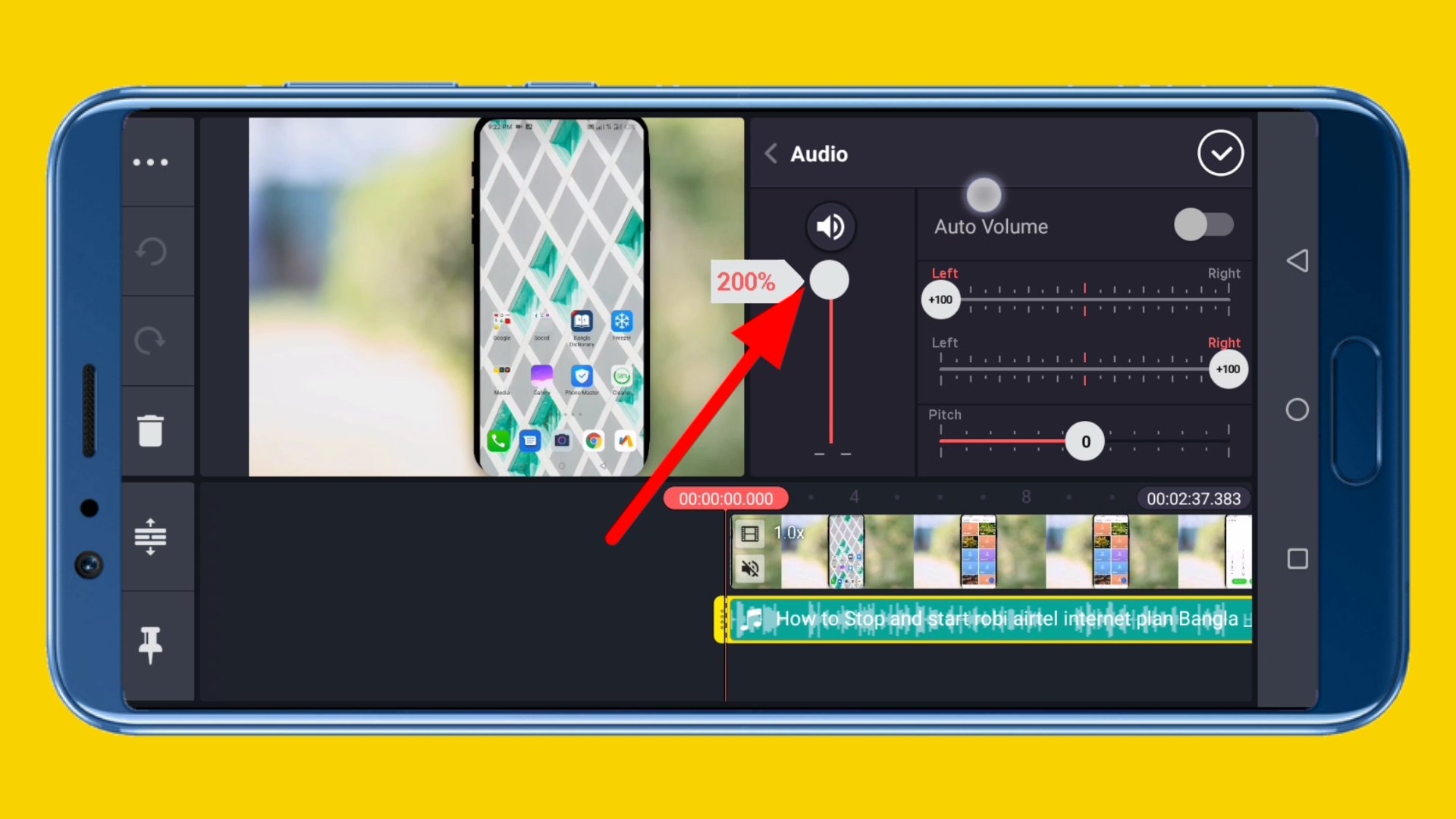 ৪. এক্ষেত্রে আপনি এখান থেকে যদি সাউন্ড 200% করে দেন, তাহলে আপনার সেই অডিও টির সাউন্ড কোয়ালিটি ডাবল হয়ে যাবে। অর্থাৎ, এক্ষেত্রে সেই অডিও টির সাউন্ড দ্বিগুণ হয়ে যাবে। কিন্তু এভাবে করে ও আপনার সেই অডিও টির সাউন্ড হয়তোবা আপনার মনের মত নাও হতে পারে। কেননা অনেক সময় আমাদের ভিডিওতে থাকা সাউন্ড এর পরিমাণ অনেক বেশি কম হয়ে যায়। এক্ষেত্রে আমরা যদি সেই ভিডিও সাউন্ড টি ২০০ শতাংশ ও করে দেই, তবুও আমাদের কাছে সেই সাউন্ড অনেক কম মনে হতে পারে।
