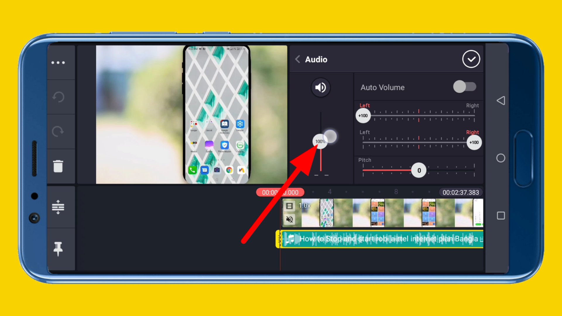 ৩. এবার আপনি এখানে আপনার সাউন্ড এর ভলিউম 100% দেখতে পাচ্ছেন। এখানে আপনার ভিডিওর সাউন্ড 100% থাকার অর্থ হচ্ছে, আপনার সেই সাউন্ড টি বর্তমানে অরিজিনাল সাউন্ড হিসেবে রয়েছে এবং এই সাউন্ড কমানো কিংবা বাড়ানো হয়নি। এবার আপনি এখান থেকে এটিকে ধরে উপরের দিকে টেনে বাড়িয়ে দেন, তাহলে আপনার সেই ভিডিওর সাউন্ড বেড়ে যাবে। অর্থাৎ, আপনার সেই অডিও টির সাউন্ড বেড়ে যাবে, আপনি এখান থেকে যত শতাংশ সাউন্ড বাড়িয়েছেন।