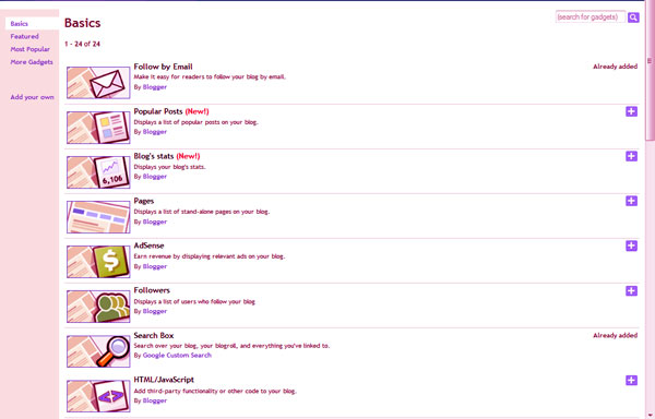 ৮.সাম্প্রতিক পোস্ট(RECENT POST) GADGET: আপনার সাইটে সাইন ইন করুন ডিজাইন /Design এ ক্লিক করুন।এবার একটি গ্যাজেট যুক্ত করুন/Add a Gadget এ ক্লিক করুন।নতুন একটি উইন্ডো আসবে এবং একেবারে বামে বৈশিষ্ট্য/ Featured সিলেক্ট করুন।আপনি সাম্প্রতিক পোস্ট/ RECENT POST নামক গ্যাজেট দেখতে পাবেন।এর ডানপাশে যুক্ত করুন/+বাটনে ক্লিক করুন।ব্যাস আপনার কাজ শেষ।এবার টেমপ্লেট সংরক্ষন/Save Templet এ ক্লিক করে সেভ করুন।