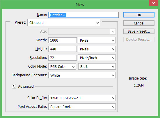 এবার ctrl+n চেপে বা File মেনু থেকে New সিলেক্ট করে Clipboard এর পরিমাপে নতুন একটি ডকুমেন্ট খুলবো। এখানে কোন পরিবর্তন করতে হয় না, যা থাকে তাই দিয়ে ওকে করতে হয়।