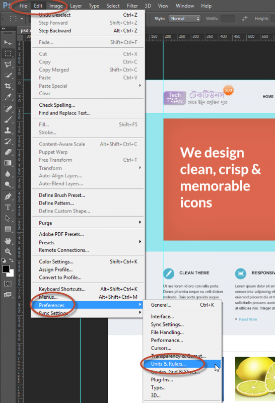 এই অপশন টি CS6 ও CC তে বিল্টিন অবস্থায় থাকলেও এর পরিমাপ inch তে দেখায়। আমাদের দরকার Pixel এ। এর জন্য ছোট একটি সেটিং করতে হবে। ফটোশপ এর টপ বার থেকে Edit > Preferences > Units and Rulers এ ক্লিক করুন।