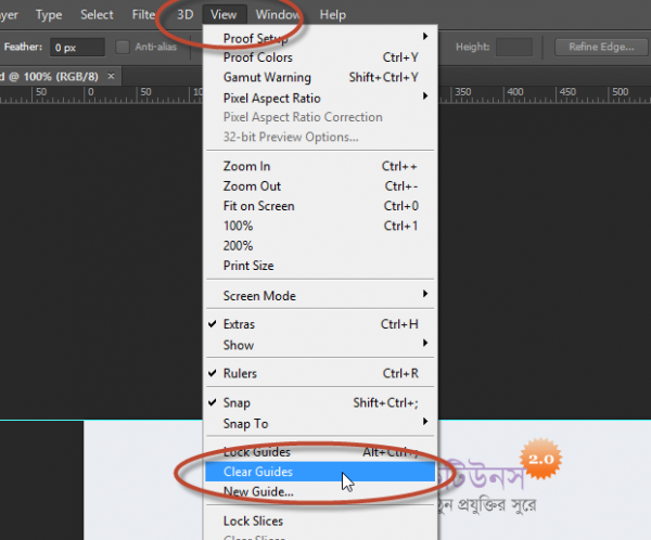 স্লাইস করতে প্রথমে টেমপ্লেট এর ডিফল্ট গ্রিড গুলোকে হাইড করে নিবো। এর জন্য View তে গিয়ে Clear Guides এ ক্লিক করুন।