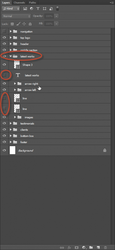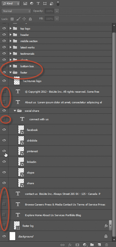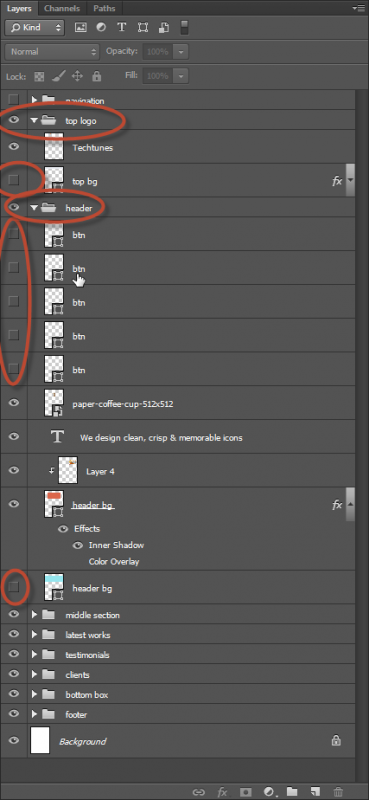Navigation লেয়ার ফোল্ডার পুরোটা অফ করে দিন। top logo থেকে top bg অফ করবেন। header থেকে নিচের মত লেয়ার গুলো অফ করে নিন।