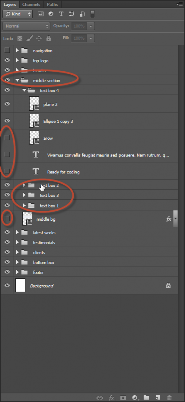 middle section থেকে নিচের মত লেয়ার গুলো অফ করবেন এবং text box 4 এর মত করে text box 1,2,3 থেকেও একই ভাবে শুধু দুটি টেক্সট ও arrow টি অফ করবেন।