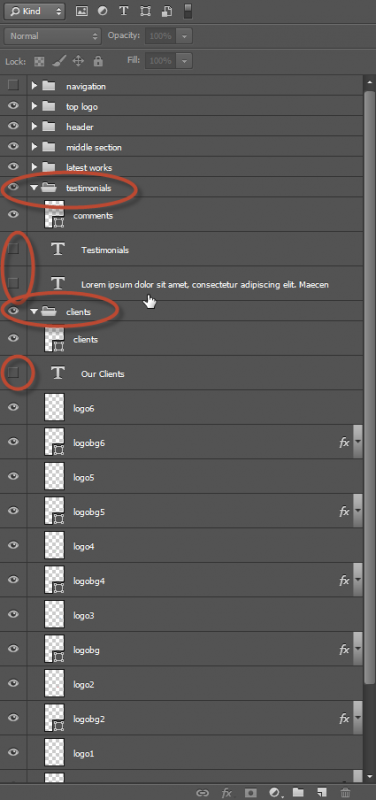 testimonial ও clients থেকে নিচের তিনটি লেয়ার অফ করুন।