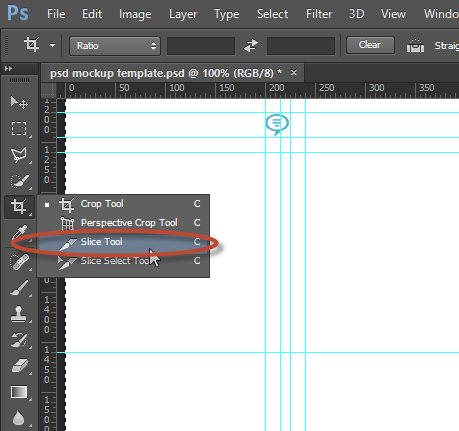 বাম পাশের টুলবার থেকে ক্রপ বাটনটি ক্লিক করে ধরে রাখুন, তাহলে একটি নতুন বার ওপেন হবে। সেখান থেকে স্লাইস টুল সিলেক্ট করুন।