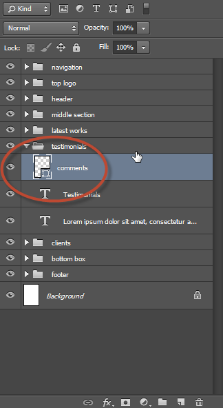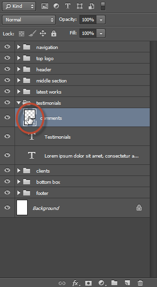 এক্ষেত্রে এই ইমেজ টির লেয়ার টি বের করুন। এই ইমেজ এর লেয়ার টি testimonial ফোল্ডার এ comments নামে আছে।