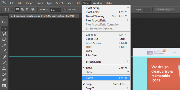 গ্রিড ব্যবহার করতে হলে আপনাকে ফটোশপ এ রুলার ইনেবল করতে হবে। এর জন্য প্রথমে যেকোনো একটি ফাইল ওপেন করে নিন, অথবা আমাদের পিএসডি মোকাপ টি ওপেন করুন। এবার View তে গিয়ে Rulers এ ক্লিক করুন। অথবা কিবোর্ড এ CTRL + R চাপুন, তাহলেই রুলার চলে আসবে।
